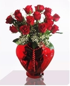 Kalpli vazo içerisinde 15 adet kırmızı gülden oluşmuş şık bir aranjman.