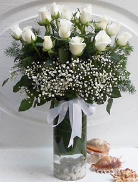 Cam vazo içinde yeşillikler ve cipsolarla süslenmiş 15 adet beyaz gül aranjmanı ile sevdiklerinize zerafet ve masumiyet dolu hislerinizi gösterin.