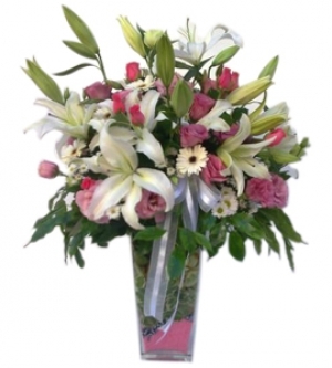 Rengarenk çiçeklerden oluşan aranjman tasarımıyla sevdiklerinize kendilerini özel hissettirin cam vazo içinde beyaz lilyumlar,gerbera çiçekleri ve güllerden oluşan aranjman tasarımı için hemen online sipariş verin.