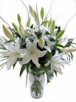 Cam vazo içinde yeşilliklerle süslenmiş beyaz kazablanka çiçeklerinden oluşan aranjman tasarımıdır.Beyazlar içinde peri ışıltısı aranjmanı ile sevdiklerinize zerafet ve masumi duygularınızı gösterin.